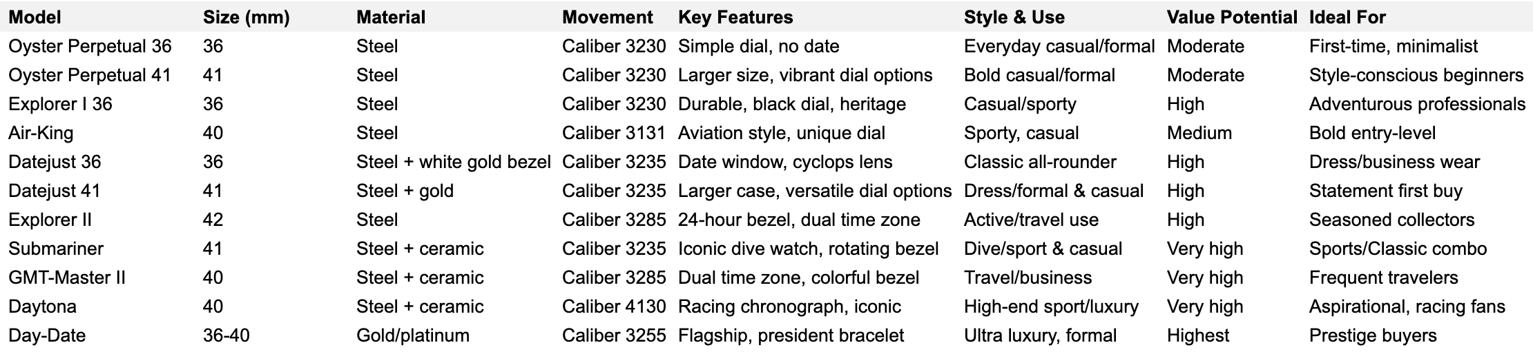 On a careful budget: Oyster Perpetual offers the timeless Rolex look with minimal fuss—perfect for starting out and daily wear.